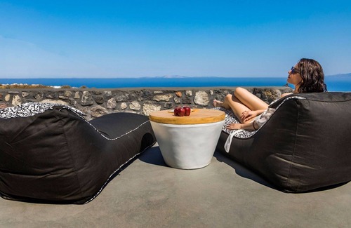 The Villa boasts two individual cave suites with separate entrances expanding on a 60 square meters area. The master suite features a bedroom with a built-in king-size bed, ensuite bathroom with shower, and a living area whereas the second suite features a smaller bedroom with a built-in queen-size bed and ensuite bathroom with shower. Its outdoor semi-private terrace features an outdoor plunge pool, outdoor furniture, and sunbeds.